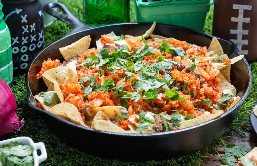 - Consider buffet-style service and an assembly-line approach: Set identical dishes on both sides of a longer table or counter so guests can navigate without congestion. Dishes like the nachos are best served as assemble-it-yourself, allowing everyone to customize their plate with the toppings they prefer.