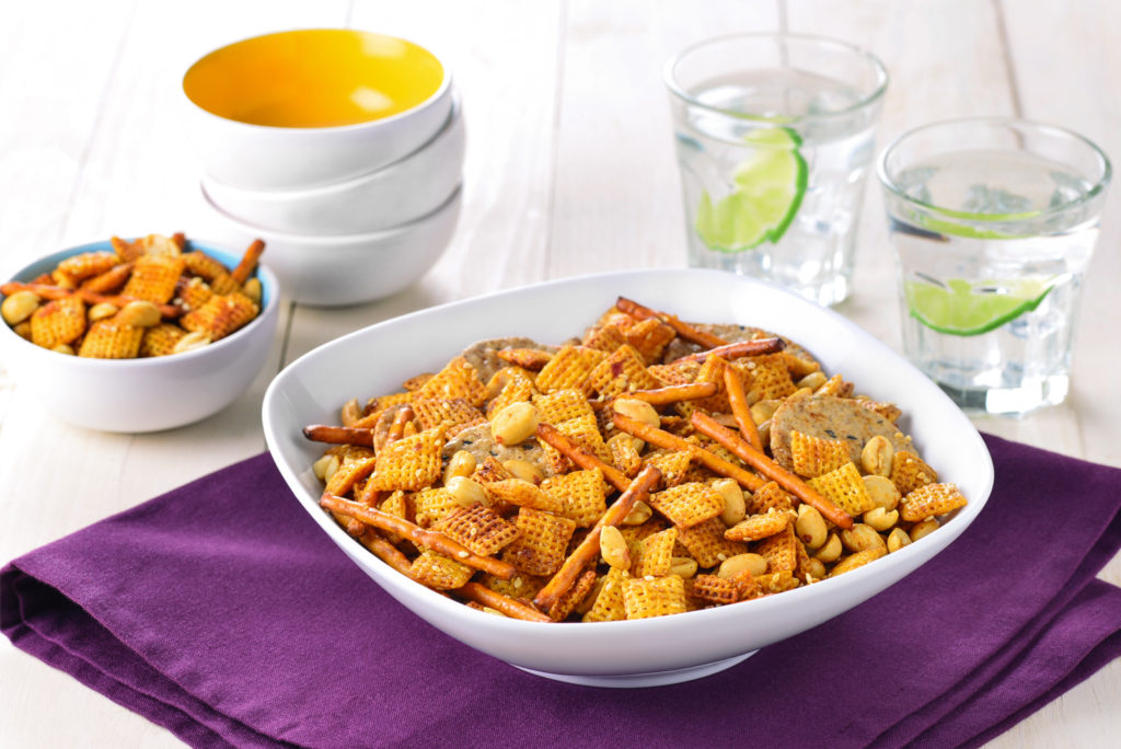 For another sweet-heat crunch snack, try this party mix — blended with ingredients like peanuts and corn cereal squares.