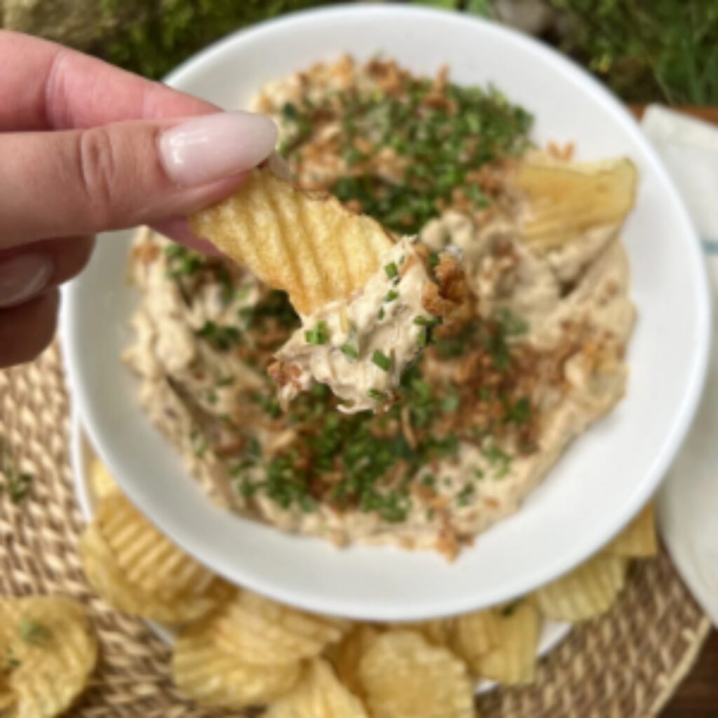 This dip is popular with guests seeking a creamy, flavorful option that’s anything but boring, with deep savory notes that complement the saltiness of potato chips.