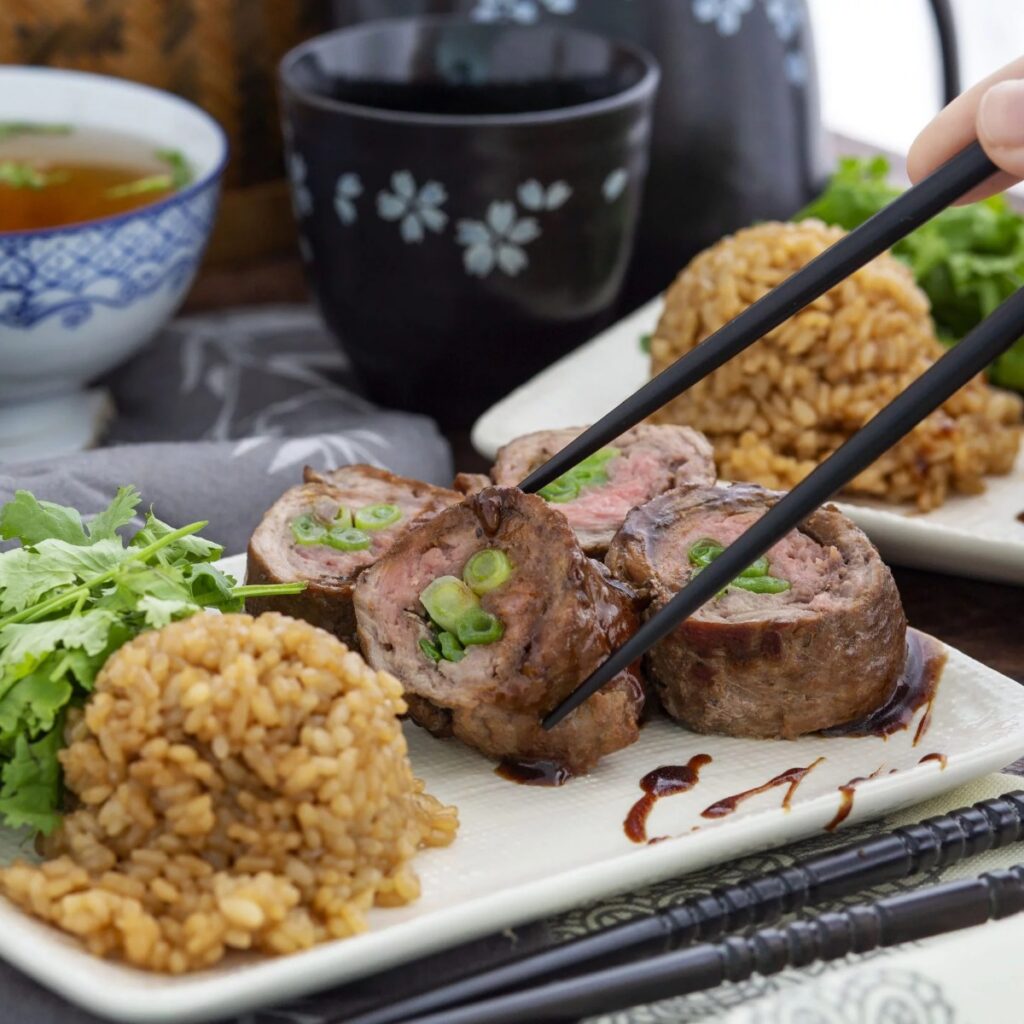 Thinly pounded flank steak rolled around crisp scallions creates a stunning spiral visual that looks technical but is surprisingly approachable. Finishing the sear with SAN-J Teriyaki Sauce allows it to reduce into a thick, glossy lacquer that coats the meat perfectly without wheat-based thickeners.