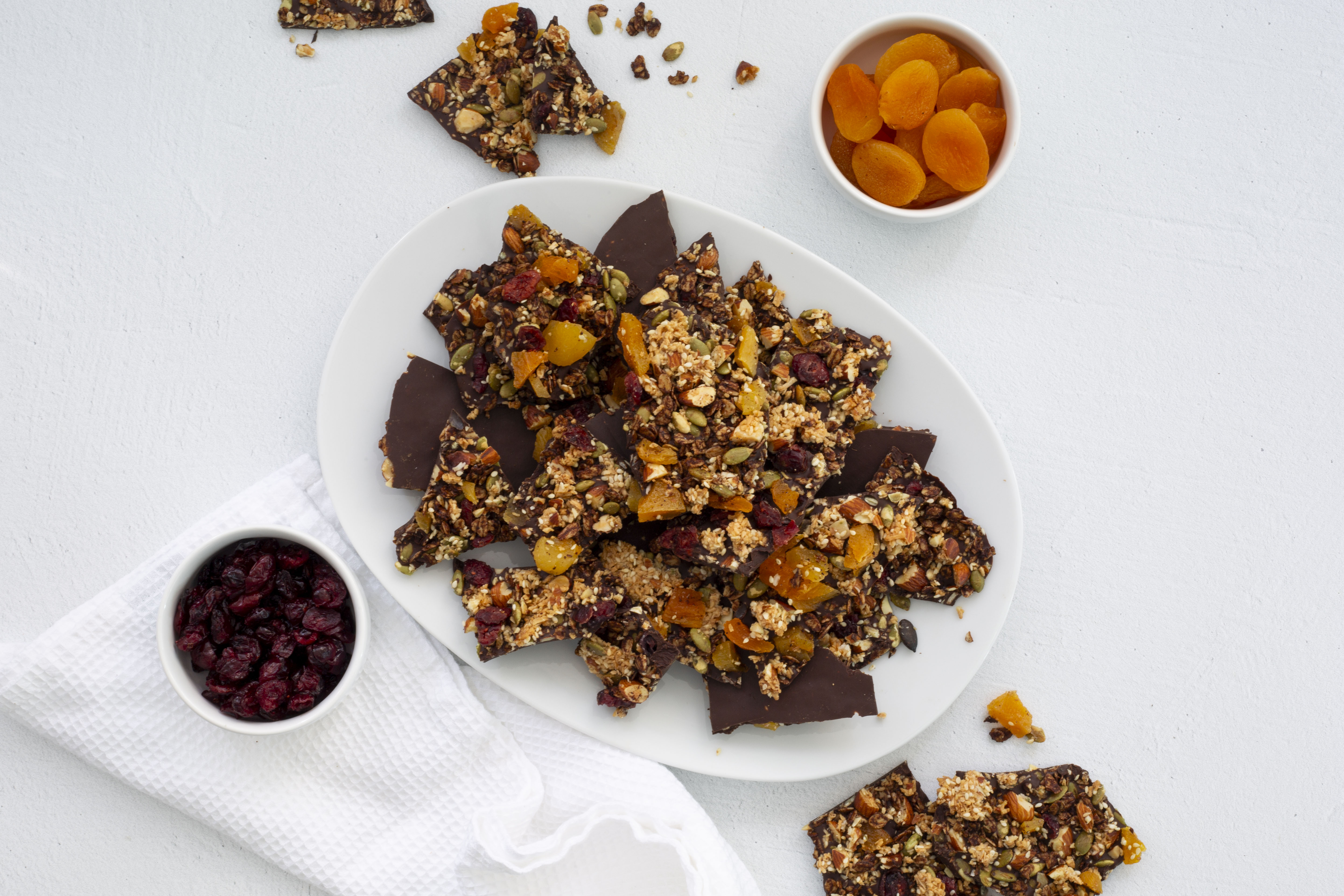 Pour melted chocolate onto parchment lined baking sheet about ¼-inch thick. Sprinkle granola mixture on top, pressing lightly into the chocolate. Refrigerate for 3 hours or until cold. Break into pieces, store in an airtight container in the refrigerator.