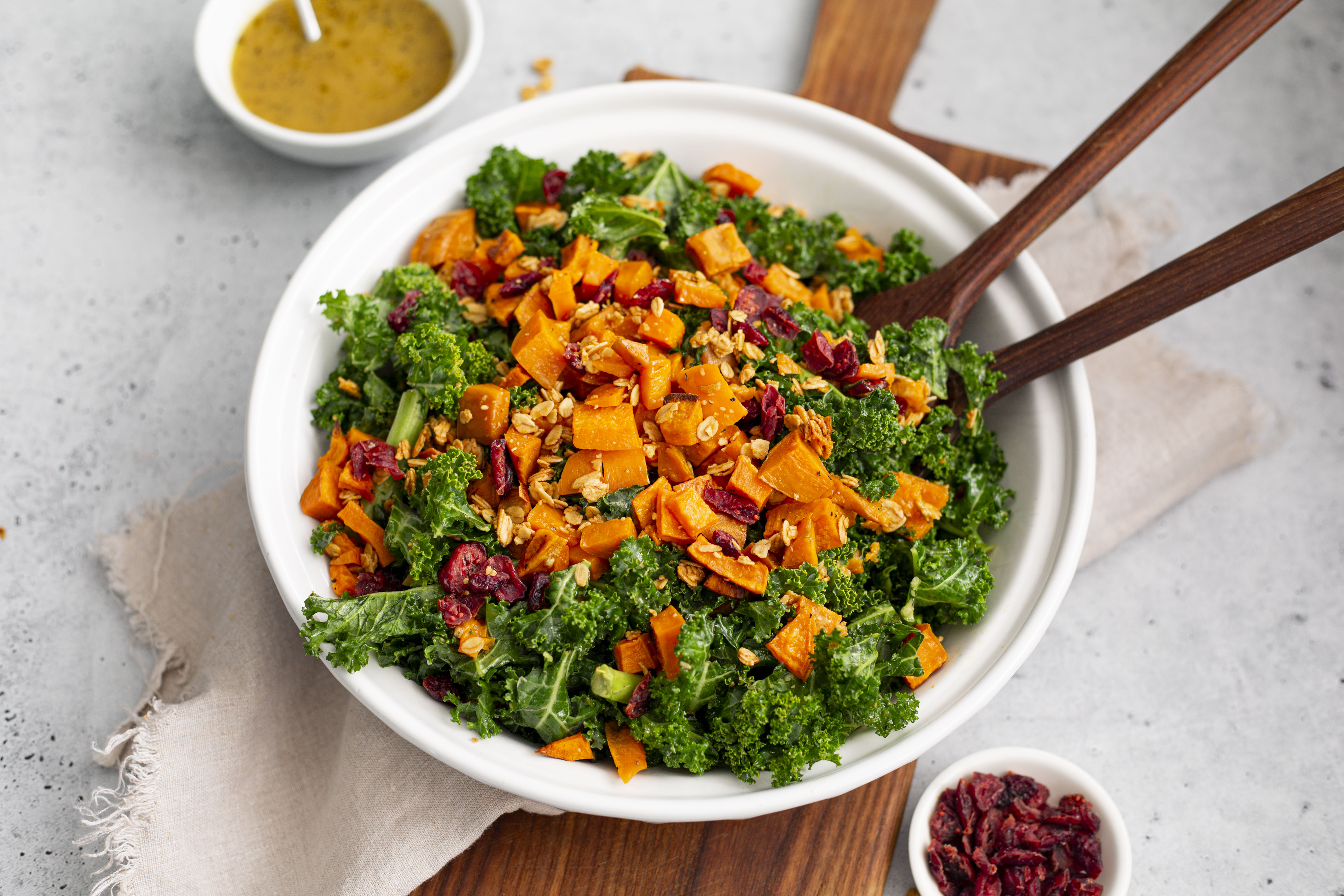 Add the roasted sweet potatoes, SAN-J Premium Koji Granola, and dried cranberries to the kale. Drizzle with the dressing and toss to coat.