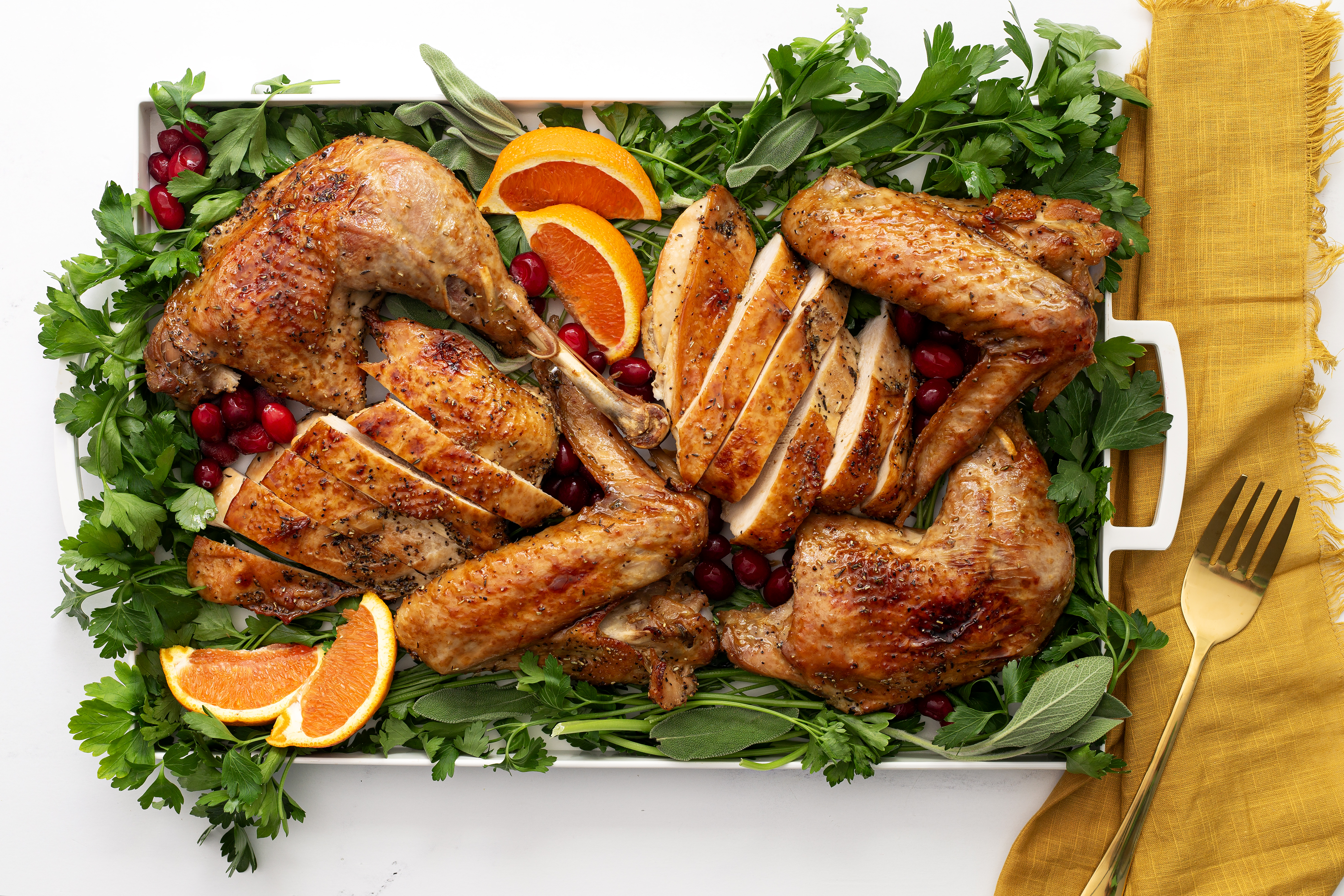 Line the bottom of a large roasting pan with onion slices, orange slices, smashed garlic cloves, and rosemary sprigs to form a vegetable “rack.” Pour in 1 cup of chicken broth. Lay the turkey parts on top of the vegetables, skin-side up.